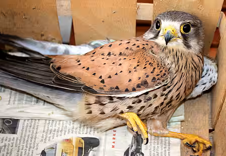 Der Turmfalke (Falco tinnunculus) ist ein in unseren Breiten noch recht häufig vorkommender Greifvogel. Allein in Berlin leben zwischen 200 und 300 Brutpaare. Als Kulturfolger bevorzugen Turmfalken zum Nestbau traditionell Nischen und Mauervorsprünge zum Beispiel an alten, hohen Gebäuden wie Schulen, Rathäusern und Kirchtürmen (daher der Name). Turmfalken sind sehr geschickte und schnelle Flieger. Bei der Jagd nach Mäusen und Singvögeln kann es immer wieder vorkommen, dass sie gegen Hindernisse prallen und sich verletzten.