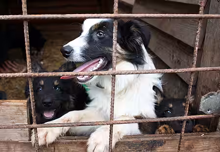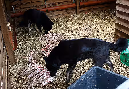 In dem kleinen Holzverschlag sind weitere 7 Hunde eingesperrt: 2 erwachsene Schäferhund Mischlinge, 2 junge Bordercollies sowie 3 Schäferhund- Mix-Welpen. Die vom Kot und Urin der Tiere verdreckte Stroh-Einstreu lässt vermuten, dass die Hunde dauerhaft eingesperrt sind. Die Welpen sind so klein, dass sie nicht einmal durch das „Fenster“ hinaussehen können. In dem Verschlag liegen Rinderrippen am Boden. Nachschub ist in einer bis oben hin gefüllten Tonne vor der Hütte gelagert. Anderes Hundefutter haben wir nicht gefunden, so dass davon auszugehen ist, dass die Hunde fast ausschließlich mit diesen völlig fleischfreien Knochen ernährt werden.