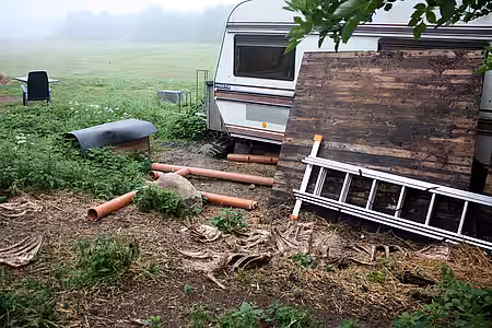 Das eingezäunte, weitläufige Gelände am Rande eines märkischen Straßendorfs westlich von Berlin im Landkreis Havelland wirkt mit seinen grasbewachsenen Hügeln und Gehölzgruppen wie ein verwilderter Golfplatz. In einer dieser Baumgruppen versteckt und für Spaziergänger unsichtbar ist die Welt alles andere als in Ordnung. Auf der Fläche stehen ein alter Wohnwagen, eine Holzhütte, ein Zelt. Dazwischen Bauteile, Abfall und Schrott. Massen von herumliegenden Tierknochen gammeln vor sich hin. Es stinkt. Ein altdeutscher Schäferhund ist an einer Laufkette festgebunden. Futter und Wasser – Fehlanzeige. Auch eine Schutzhütte steht dem Tier nicht zur Verfügung.