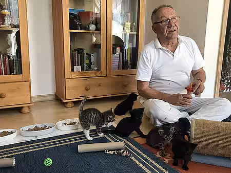 Harry Kindt hat in den vielen Jahren, die er schon mit Katzen zu tun hat, unzählige traurige Katzenschicksale erlebt. „Es wäre schön, wenn dieser Teil meiner Arbeit irgendwann überflüssig würde!“, sagt er, während er im Aufzuchtzimmer sitzt und einer kleinen schwarzen Kitte das Fläschchen mit Aufzuchtmilch in den Mund schiebt. All ihre Geschwister fressen schon selbst, doch das Kleine ist einfach noch nicht soweit. „Es sollte keine Katzen geben, die auf der Straße geboren werden! Und auch keine, die unkastriert sind.“, meint er. „Jede einzelne von ihnen ist das Opfer menschlicher Verantwortungslosigkeit! Auch dieses Kleine hier!“