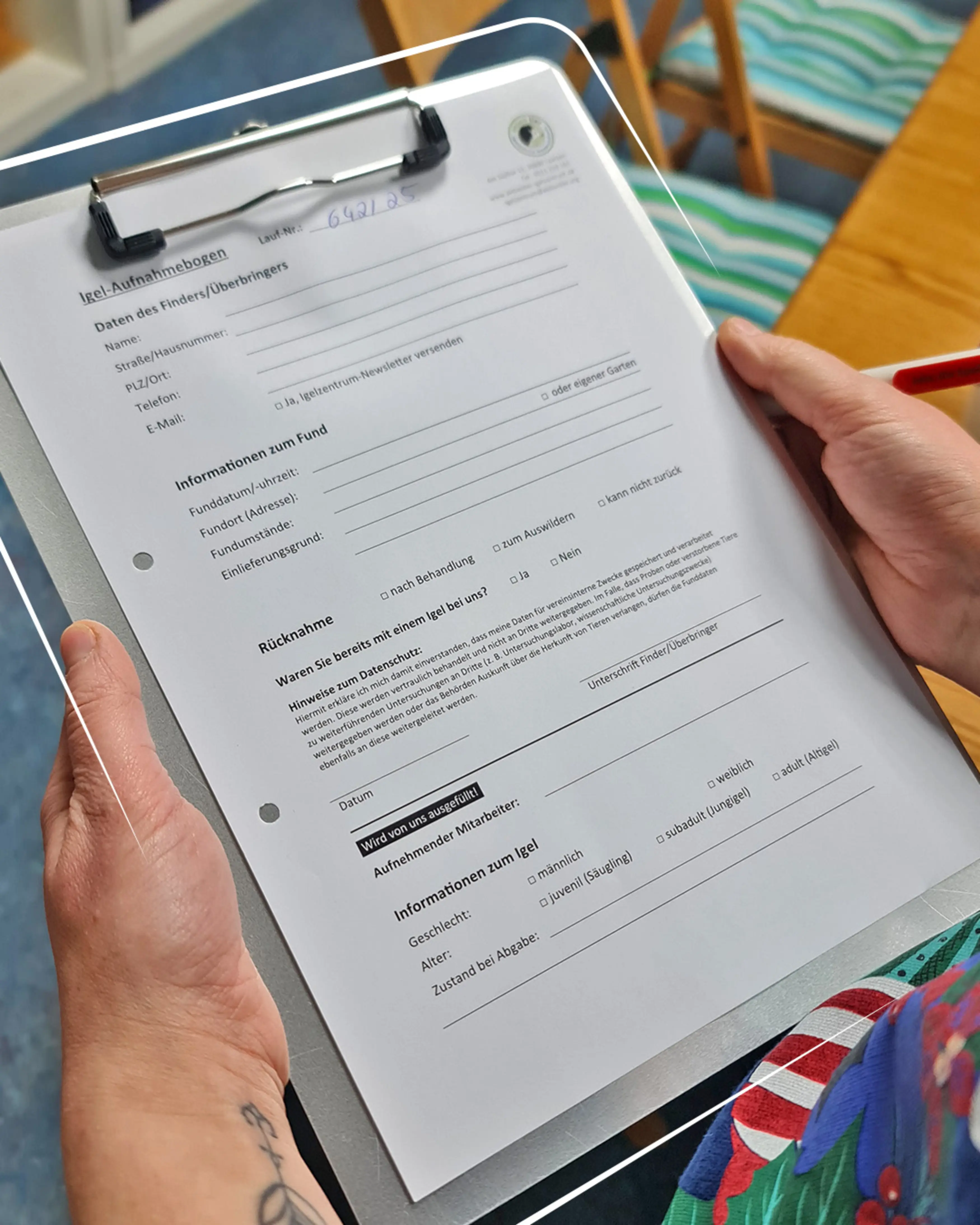 Im ersten Gespräch erfragen wir die Fundumstände, Auffälligkeiten und die vorherige Unterbringung oder Behandlung. Für jeden Igel wird ein Aufnahmebogen ausgefüllt, auf dem wir Informationen zum Igel und deine Kontaktdaten finden. Diese sind auch wichtig, wenn Sie den Fundigel nach Behandlung oder zur Auswilderung wieder abholen möchten. In diesem Fall rufen wir Sie bei Genesung des Igels an.