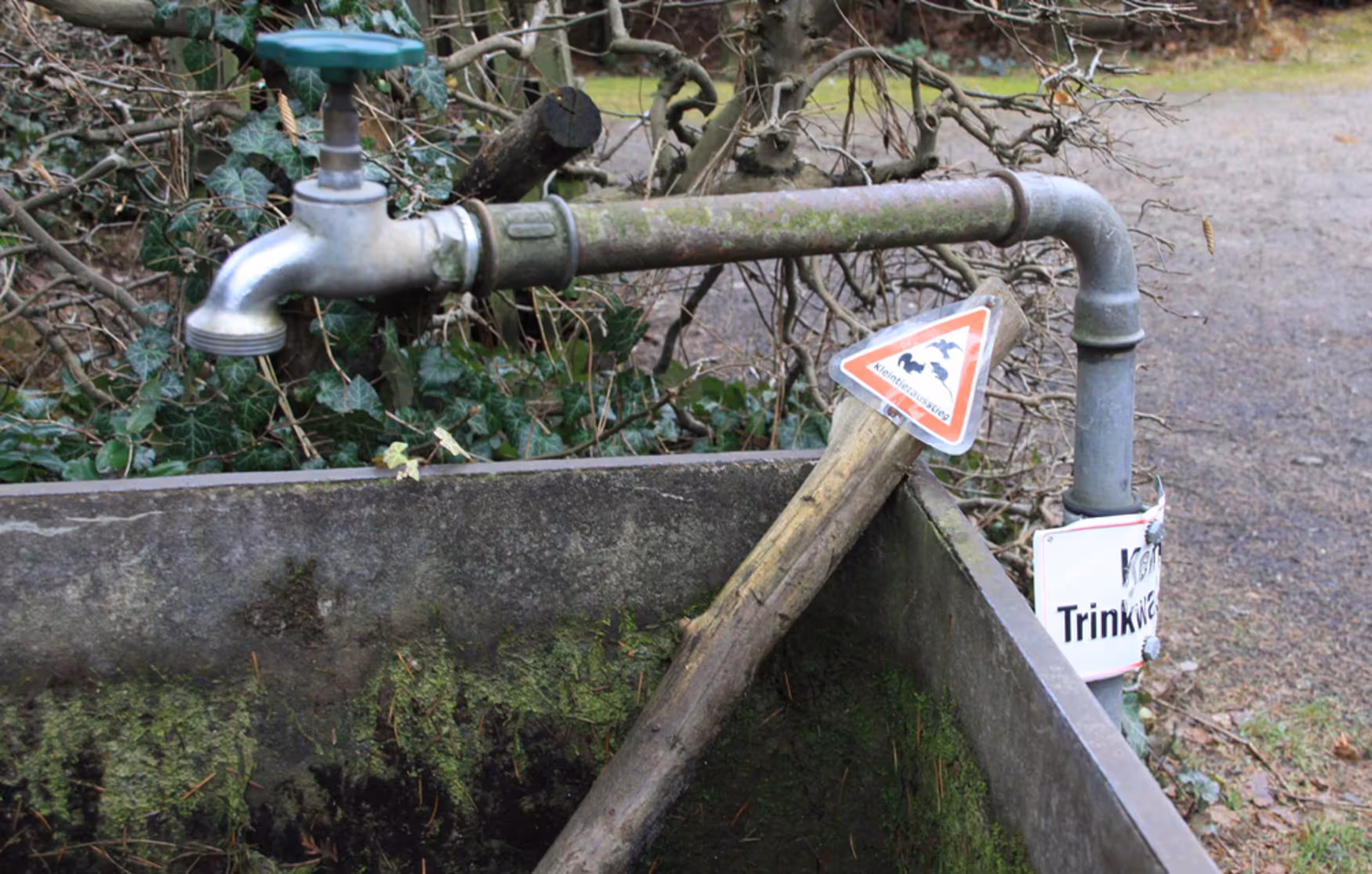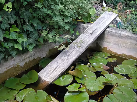 Als Ausstiegshilfe eignet sich zum Beispiel ein dicker Ast, an dem die Tiere herausklettern können. Die Rinde der Äste sollte möglichst rau sein, an glatten Oberflächen besteht die Gefahr des Abrutschens.