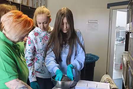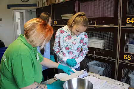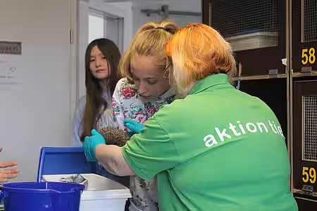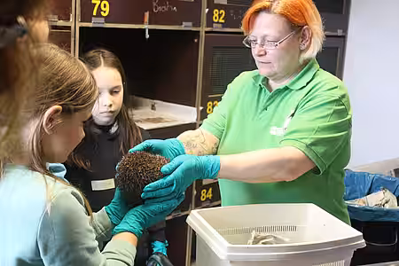Dort war dann auch Eigeninitiative der Schülerinnen gefragt: Zwei Igelboxen mussten gereinigt werden, die Igel wurden gewogen und frisches Wasser und Futter wurde verteilt. Anschließend ging es mit der Vorstellung der Berufe Tierpfleger/in und Tierarzt/-ärztin weiter.
