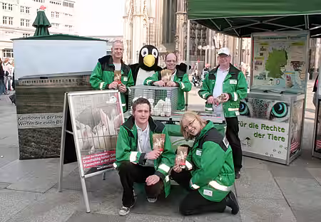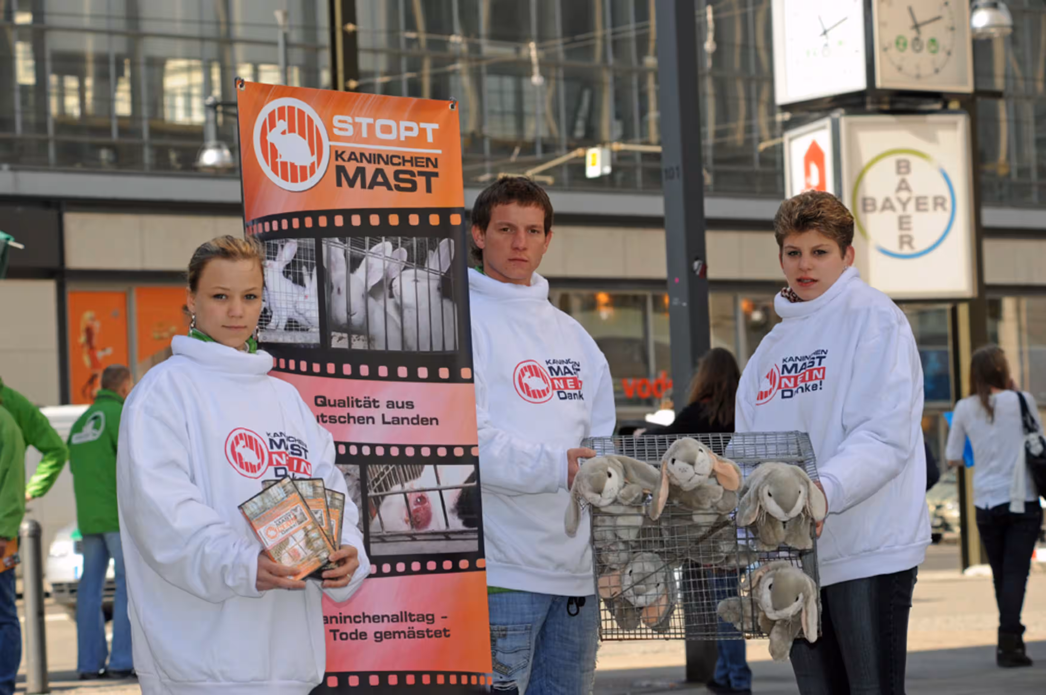 Mitten im Weihnachtstrubel hatte eine Demonstration vom Tierschutzbündnis „Kaninchenmast, nein danke“ vor „Galeria Kaufhof“ auf dem Berliner Alexanderplatz für Aufsehen gesorgt. Aktivisten forderten mit zahlreichen Bannern, Schildern und einem Kaninchen im Rollstuhl „Galeria Kaufhof“ auf, Kaninchenfleisch aus industrieller Käfighaltung auszulisten und kein Fleisch von kranken Kaninchen zu verkaufen. Jetzt teilte Kaufhof mit, dass der Verkauf von Kaninchenfleisch aus Käfighaltung in Berlin und in allen anderen Filialen eingestellt wurde. „Wir freuen uns darüber, dass Kaufhof endlich einlenkt, immer wieder haben wir mit Aktionen und Mailaktionen den Konzern aufgefordert, das Kaninchen- Qualfleisch aus dem Sortiment zu nehmen“, kommentierte einer der Organisatoren.