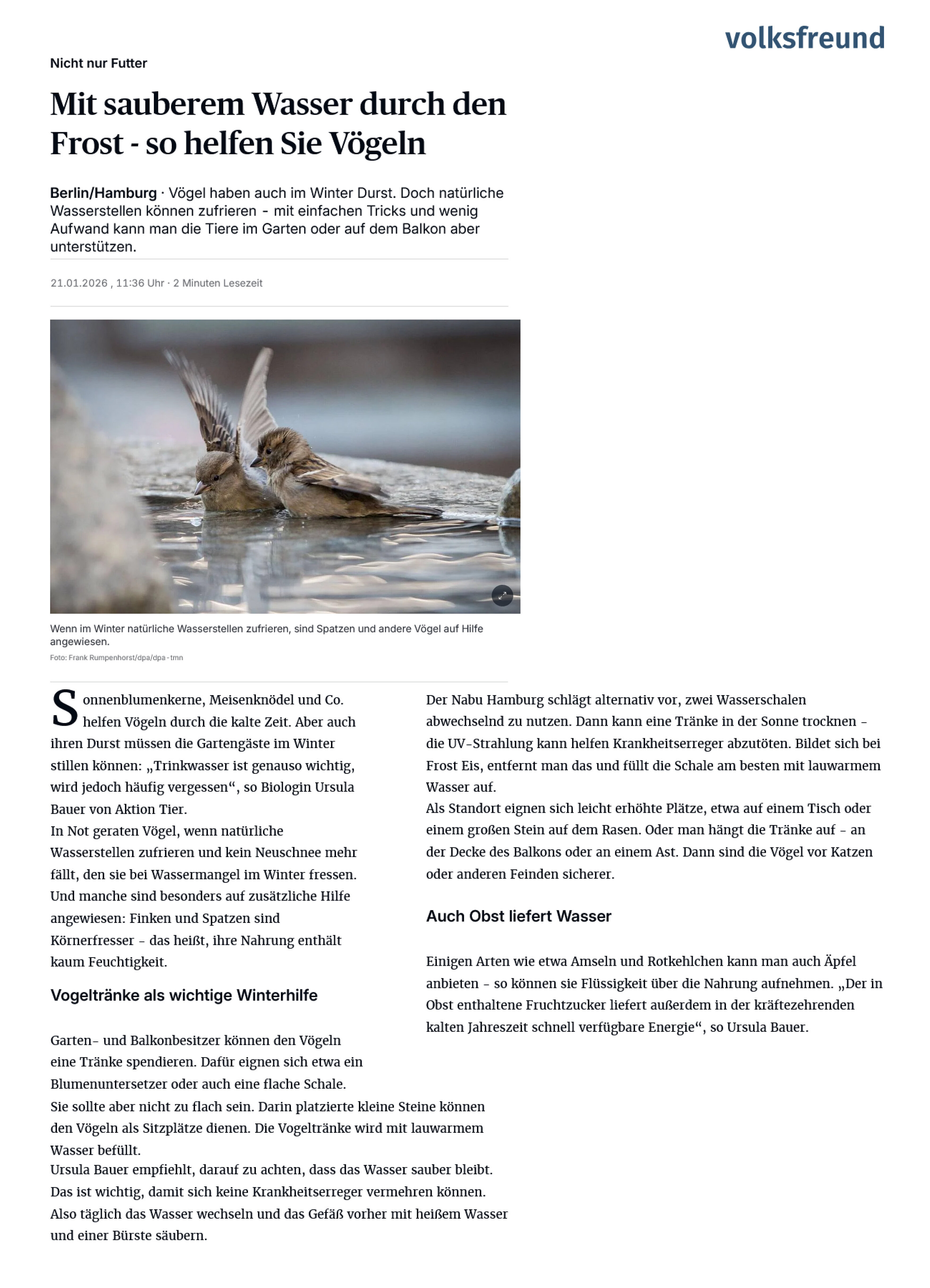 Publikationen Pressespiegel 2026 2025 2024 2023 2022 2021 2020 2019 2018 2017 2016 2015 2014 2013 2012 2011 2010 2009 2008 21. Januar 2026 Mit sauberem Wasser durch den Frost - so helfen Sie Vögeln volksfreundOriginalartikel lesen 21. Januar 2026 Ausgefallener Nebenjob: Familienvater verdient mit Hundekot mehr als auf dem Bau Fokus onlineOriginalartikel lesen 30. Dezember 2025 Hunde und Kastanien: Warum die kleinen Nüsse so gefährlich sind Südkurier 30. Dezember 2025 Bitte nicht! Warum Weihnachtsbäume kein Tierfutter sind STIMME 27. Dezember 2025 Rettung an Weihnachten: Uhu zur Auffangstation gebracht Stern 26. Dezember 2025 Wie gehts es den Igeln in Niedersachsen? Antenne Niedersachsen 25. Dezember 2025 Zu viele verletzte Igel: Aufnahmestopp hannover t-online 19. Dezember 2025 Weihnachtliche Deko mit Risiko: So schützen Sie Haustiere vor Kerzen, Misteln & Co. Frankfurter Neue Presse Seite 1 von 42 Seiten 123456789101112131415161718192021222324252627282930313233343536373839404142 nächste