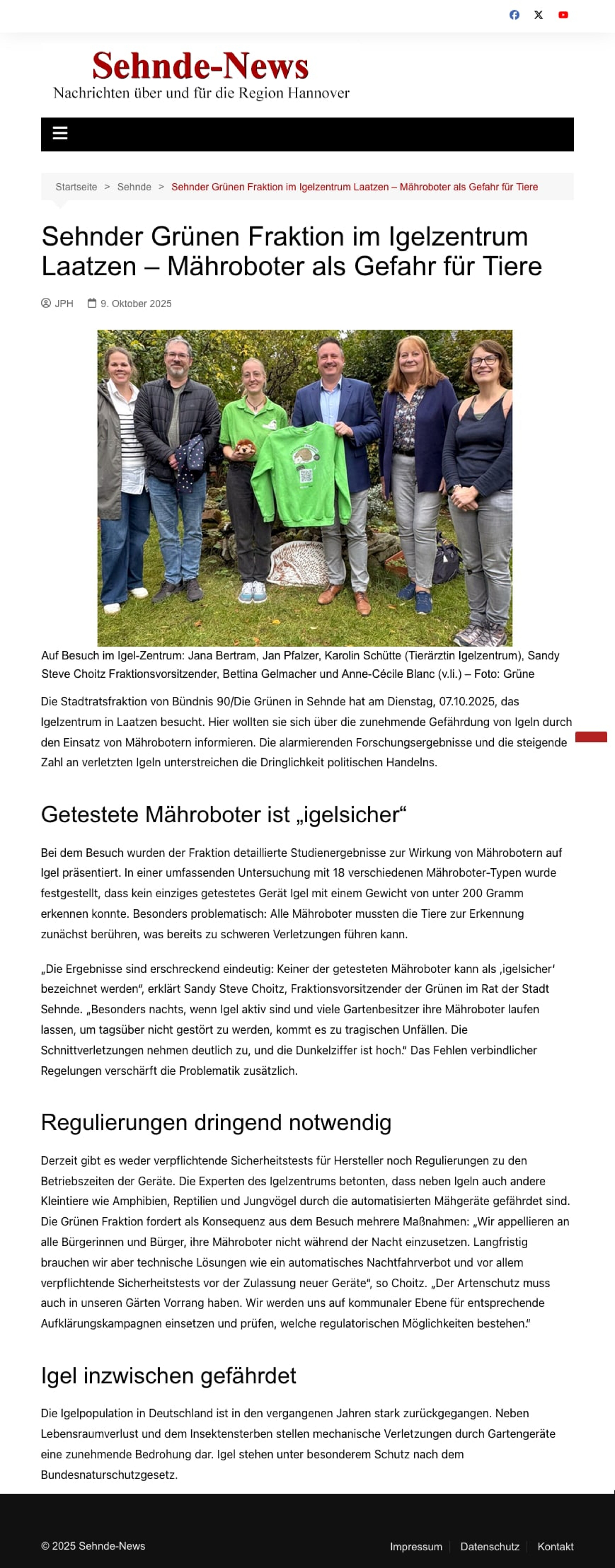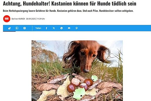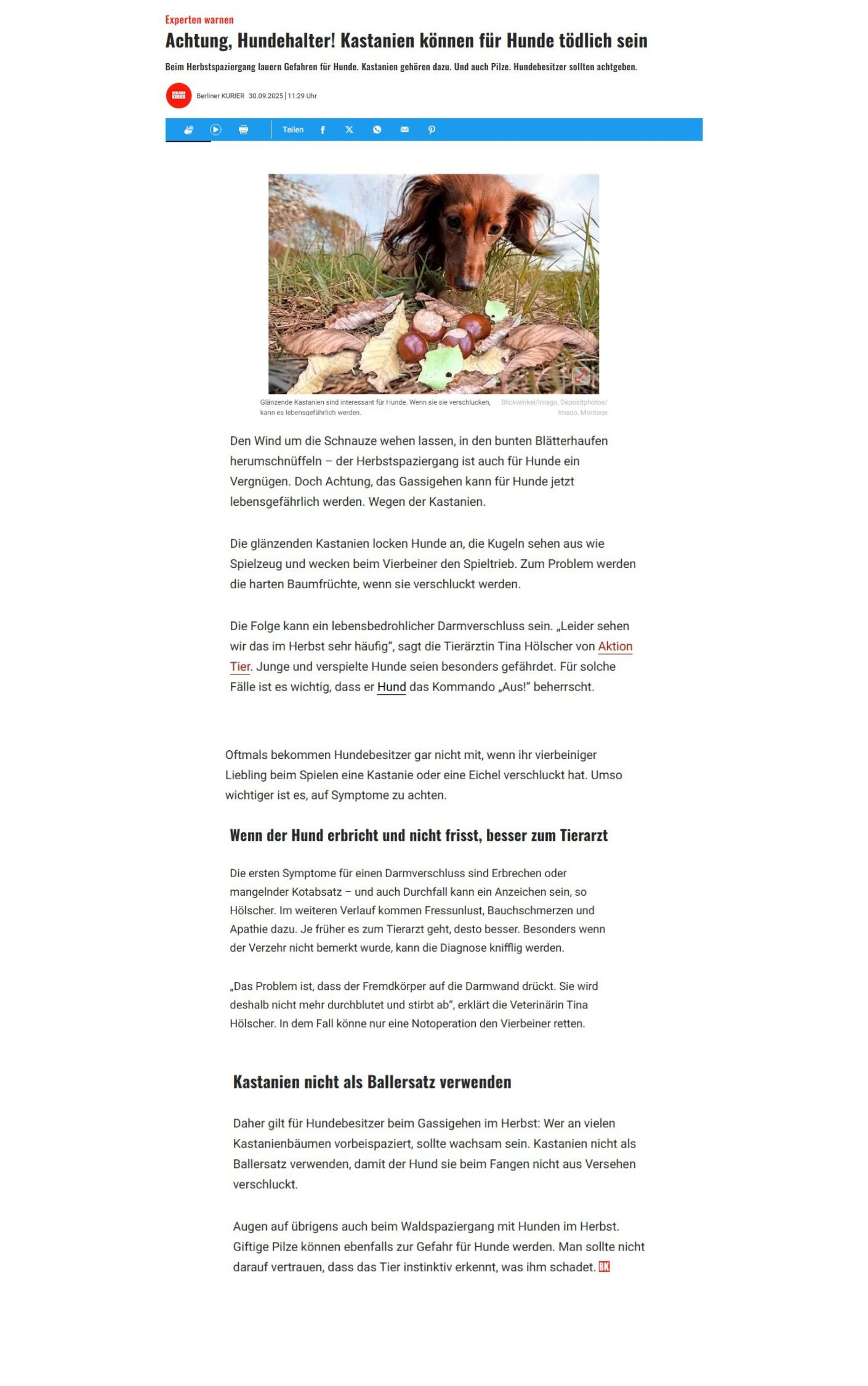 Publikationen Pressespiegel 2025 2024 2023 2022 2021 2020 2019 2018 2017 2016 2015 2014 2013 2012 2011 2010 2009 2008 12. Oktober 2025 Eine Brücke für Eichhörnchen Süddeutsche ZeitungOriginalartikel lesen 09. Oktober 2025 Sehnder Grünen Fraktion im Igelzentrum Laatzen – Mähroboter als Gefahr für Tiere Sehnde-NewsOriginalartikel lesen 04. Oktober 2025 Herz für Hörnchen & Co - Mit gespannten Seilen und Kastration Leid verhindern TagesspiegelOriginalartikel lesen 04. Oktober 2025 Herz für Tiere in Berlin: Mit gespannten Seilen und Kastration Leid verhindern Der TagesspiegelOriginalartikel lesen 30. September 2025 Achtung, Hundehalter! Kastanien können für Hunde tödlich sein Berliner KurierOriginalartikel lesen 25. September 2025 Tierärztin warnt – Herbstspaziergang mit Hund - Vorsicht vor Kastanien General-AnzeigerOriginalartikel lesen 11. September 2025 Giftige Eibe: Gefährlich für Hund und Katze Süddeutsche ZeitungOriginalartikel lesen 10. September 2025 Genial einfach: Mit diesem Trick locken Sie Wespen weg vom Tisch ChipOriginalartikel lesen Seite 1 von 125 Seiten 123456789101112131415161718192021222324252627282930313233343536373839404142434445464748495051525354555657585960616263646566676869707172737475767778798081828384858687888990919293949596979899100101102103104105106107108109110111112113114115116117118119120121122123124125 nächste