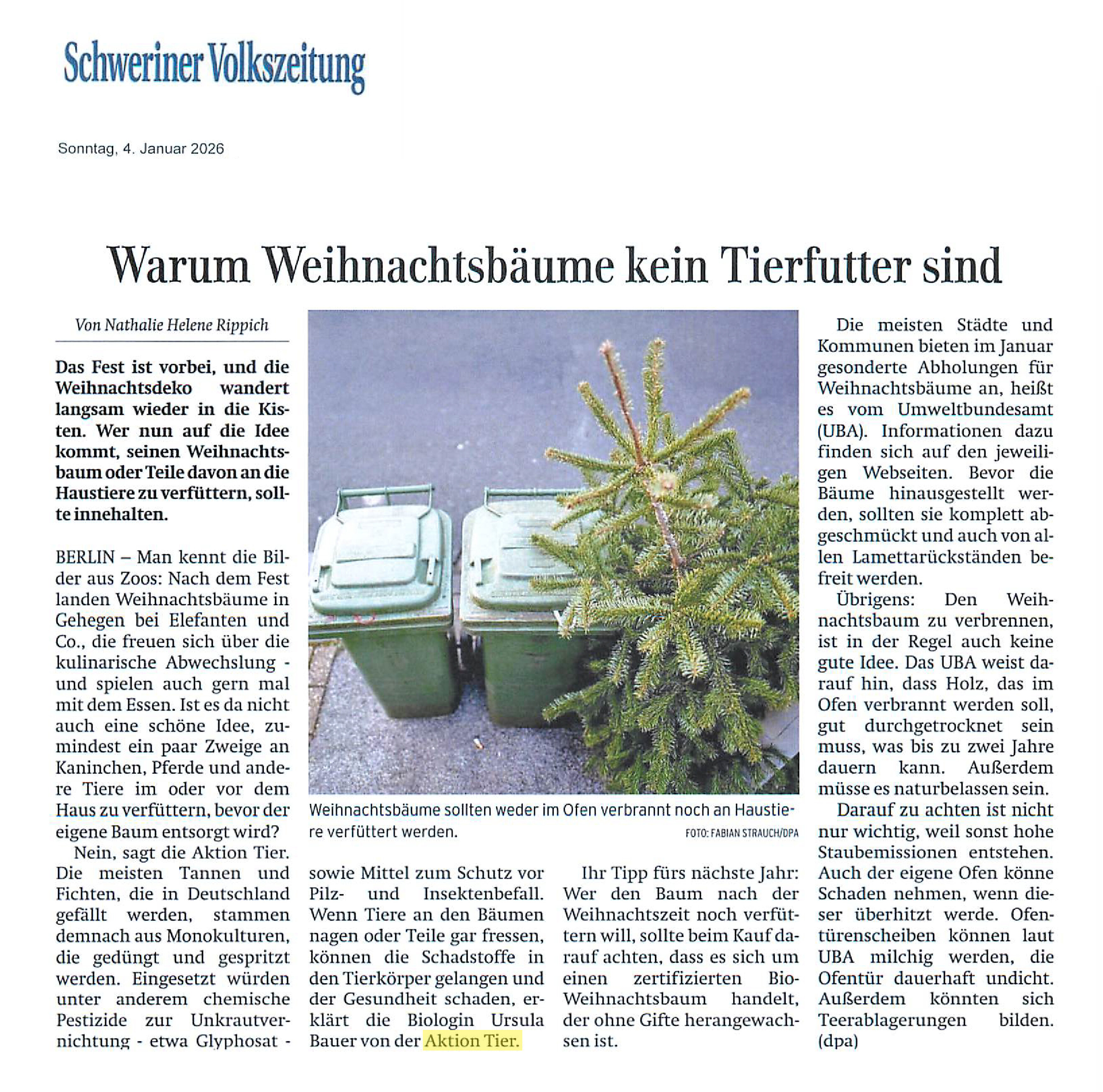 Publikationen Pressespiegel 2026 2025 2024 2023 2022 2021 2020 2019 2018 2017 2016 2015 2014 2013 2012 2011 2010 2009 2008 28. Januar 2026 Tierschützerin widerspricht Tierarzt Märkische Oderzeitung 26. Januar 2026 Tierschützerin widerspricht Tierarzt Zeitung 23. Januar 2026 Mit sauberen Wasser Vögeln durch den Frost helfen Volksblatt 21. Januar 2026 Mit sauberem Wasser durch den Frost - so helfen Sie Vögeln volksfreundOriginalartikel lesen 21. Januar 2026 Ausgefallener Nebenjob: Familienvater verdient mit Hundekot mehr als auf dem Bau Fokus onlineOriginalartikel lesen 15. Januar 2026 Haustiere schützen Landshut aktuell 04. Januar 2026 Warum Weihnachtsbäume kein Tierfutter sind Schweriner Volkszeitung 30. Dezember 2025 Hunde und Kastanien: Warum die kleinen Nüsse so gefährlich sind Südkurier Seite 1 von 42 Seiten 123456789101112131415161718192021222324252627282930313233343536373839404142 nächste