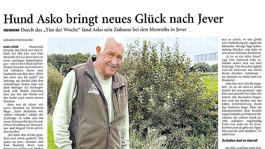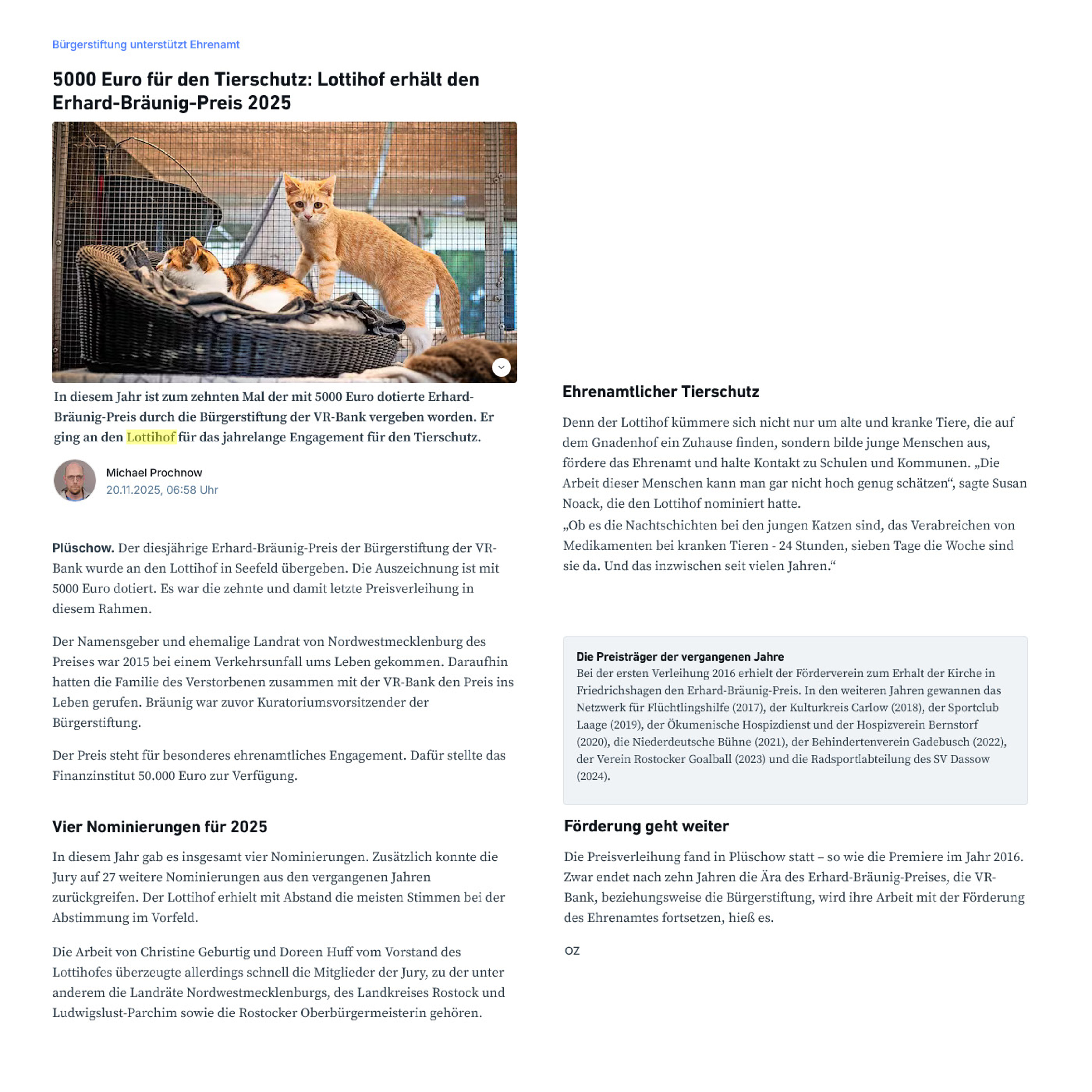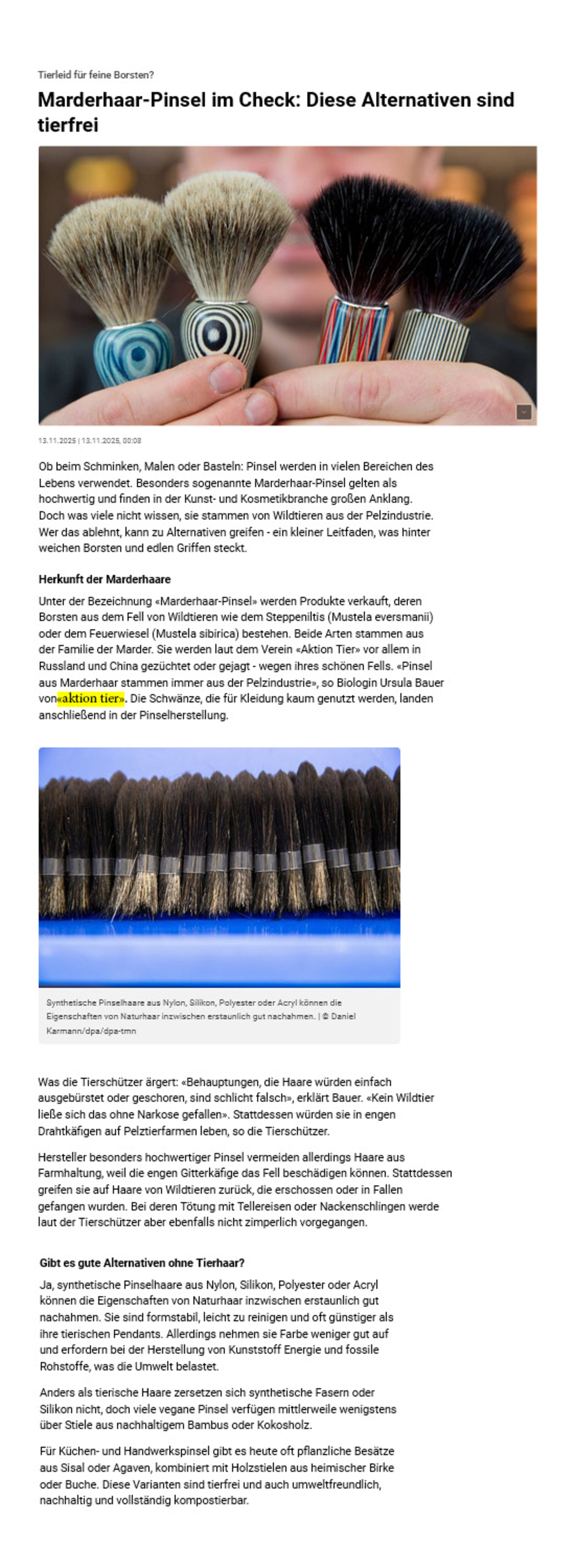 Publikationen Pressespiegel 2026 2025 2024 2023 2022 2021 2020 2019 2018 2017 2016 2015 2014 2013 2012 2011 2010 2009 2008 22. November 2025 Toten Vogel gefunden - was tun? Heidenheimer Zeitung 21. November 2025 Wenn die Muskeln zittern Halterner Zeitung 20. November 2025 Drei Tipps Vögel füttern, ohne Ratten anzulocken Viechtach aktuell 20. November 2025 5000 Euro für den Tierschutz: Lottihof erhält den Erhard-Bräuning-Preis 2025 Ostsee Zeitung 14. November 2025 Marderhaar-Pinsel im Check: Diese Alternativen sind tierfrei Westfälische Nachrichten 14. November 2025 Hund Asko bringt neues Glück nach Jever Anzeiger für Harlingerland 13. November 2025 Marderhaar-Pinsel im Check: Diese Alternativen sind tierfrei Neue Westfälische 09. November 2025 Achtung, blinder Passagier! Warum Sie Ihr Auto im Winter immer vor dem Start prüfen sollten RedaktionsNetzwerk DeutschlandOriginalartikel lesen Seite 3 von 42 Seiten vorherige 123456789101112131415161718192021222324252627282930313233343536373839404142 nächste