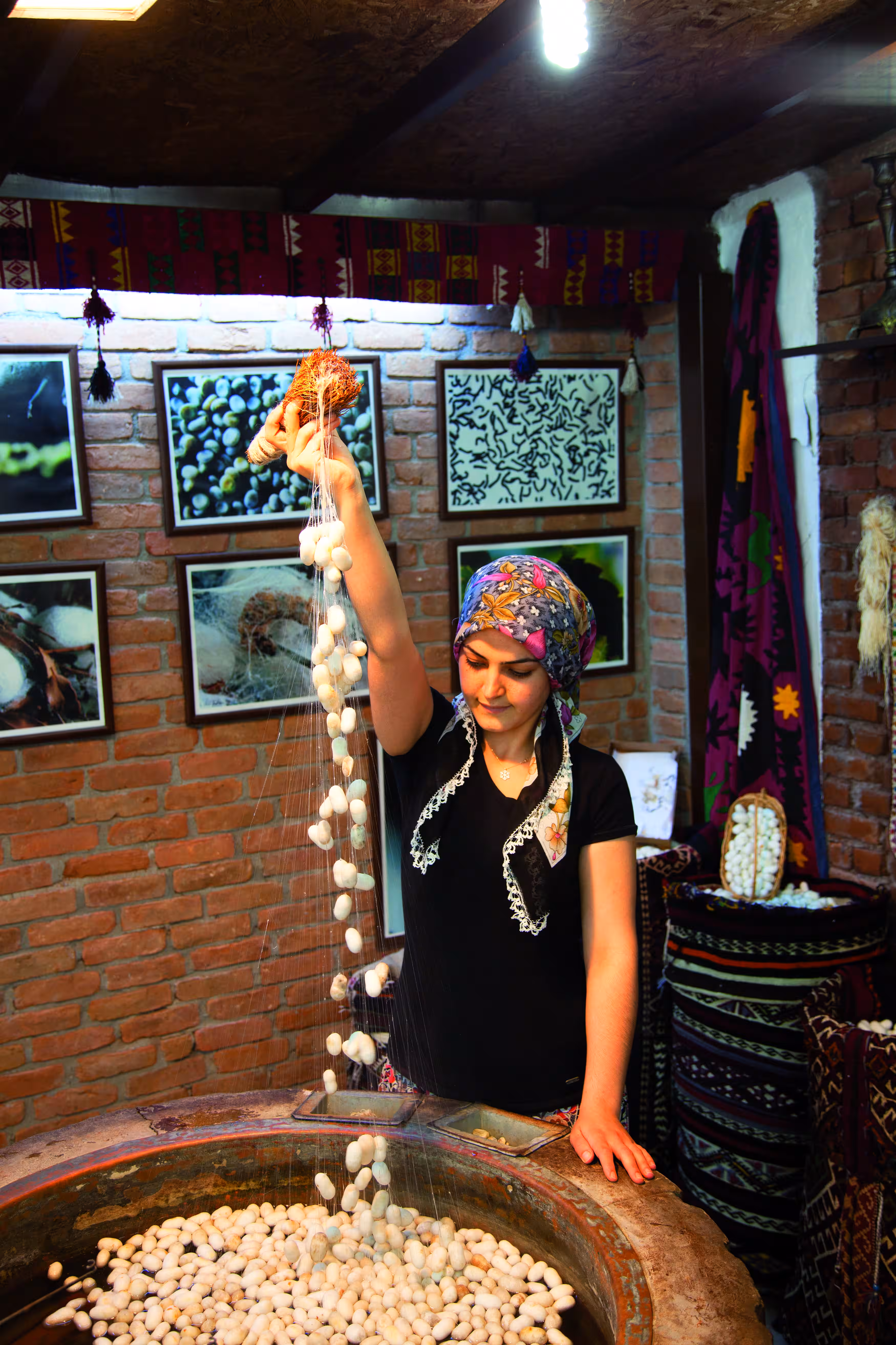 Wenn die Seidenraupen eine bestimmte Größe erreicht haben, beginnen sie, ein Proteinsekret aus speziellen Drüsen an der Unterlippe zu produzieren, welches an der Luft sofort erstarrt und zu einem stabilen Faden wird. Die Tiere winden sich hin und her und spinnen diese Seidenfäden, die über 2000 Meter lang sein können, um sich herum, bis haltbare und wasserdichte Kapseln entstanden sind. Zur Gewinnung der wertvollen Seidenfäden werden diese Kokons im Prinzip einfach wieder abgewickelt, oder, wie es in der Fachsprache heißt, abgehaspelt. Bevor das möglich ist, werden die kleinen Gespinste in heißem Wasser vom Seidenleim und der äußeren Schicht, der sogenannten Flockseide, befreit. Dann streichen Bürstchen über die gereinigten Kapseln, fangen die Anfänge der Kokonfäden auf, verzwirbeln mehrere miteinander und wickeln den Zwirn dann auf Spulen auf. Die Rohseide kann anschließend gefärbt und zu Stoff verwoben werden.